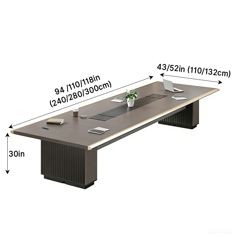 A generously sized tabletop measuring 94, 110, or 118” in length and 43 or 52” in width provides ample space for laptops, documents, and meeting essentials—ensuring organized, productive sessions.